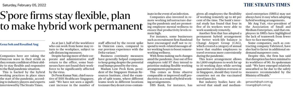 This intro on companies ‘taking the wave in their stride’ is simply too general a statement to make, especially with the earlier story on more people taking MCs although no need to do so…Better if the focus is on different types of hybrid work arrangements.
